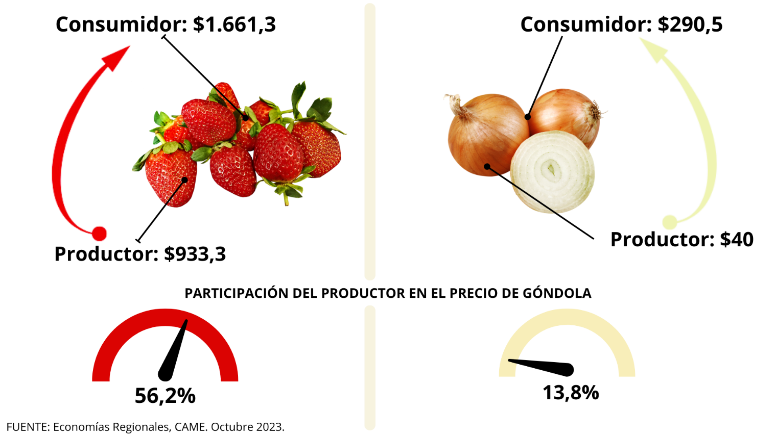En promedio, la participación del productor explicó el 24,3% de los precios de venta final. La mayor participación la tuvieron nuevamente los productores de frutilla (56,2%), mientras que la menor fue para los de cebolla (13,8%).