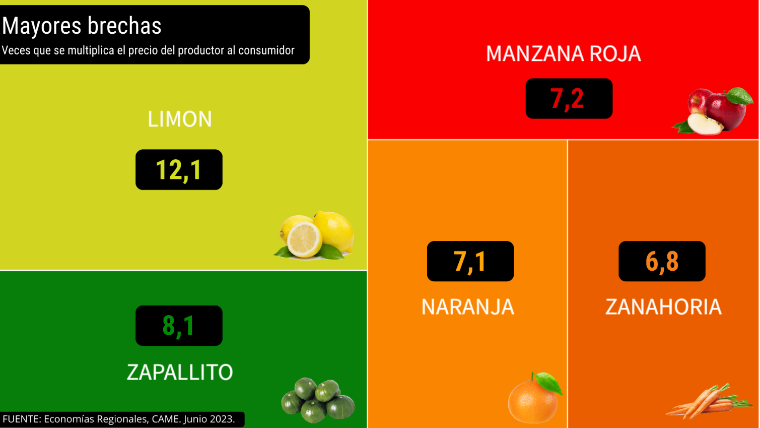 El limón (12,1 veces), el zapallito (8,1), la manzana roja (7,2), la naranja (7,1) y la zanahoria (6,8), fueron los cinco productos que presentaron mayor diferencia entre los precios de origen y destino.