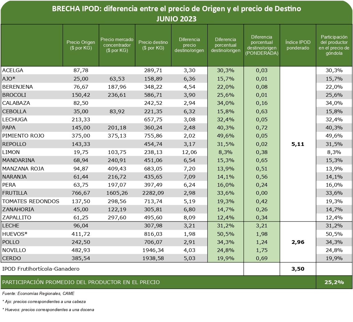 Según el Índice de Precios en Origen y Destino (IPOD) elaborado por el sector de Economías Regionales de la Confederación Argentina de la Mediana Empresa (CAME), en junio los precios de los agroalimentos se multiplicaron por 3,5 veces del campo (origen) a la góndola (destino).