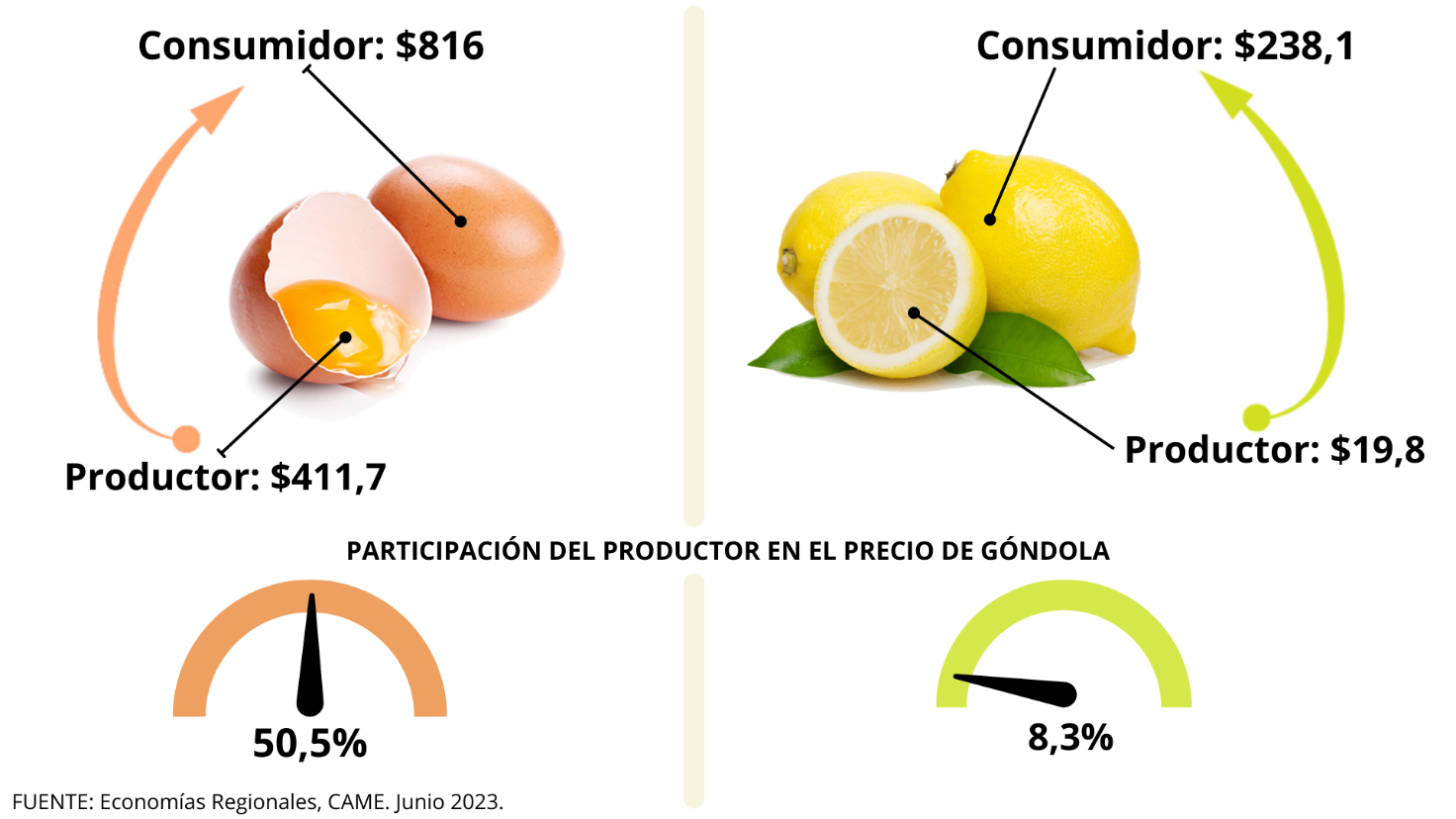 En promedio, la participación del productor explicó el 25,2% de los precios de venta final. La mayor participación la tuvieron los productores de huevo (50,5%), mientras que la menor fue para los de limón (8,3%).